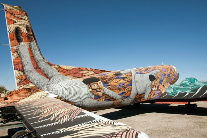 The term "bone yard" refers to the remote, desolate parking stations for these behemoth, inactive vessels in the dessert. The first installment of this expanding series, called The Boneyard Project: Nose Job, was comprised of works from over a dozen artists. This current "part 2" of the project is titled The Boneyard Project: Return Trip and features more than 30 artists. The exhibit will be at the Pima Air & Space Museum in Tucson, Arizona from January 28 until May 31, 2012.